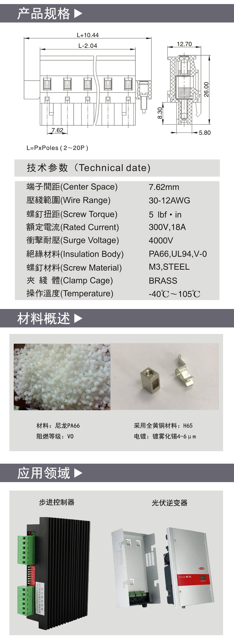 插拔式接线端子7.62间距180度直头 300V 15A 02P-24P