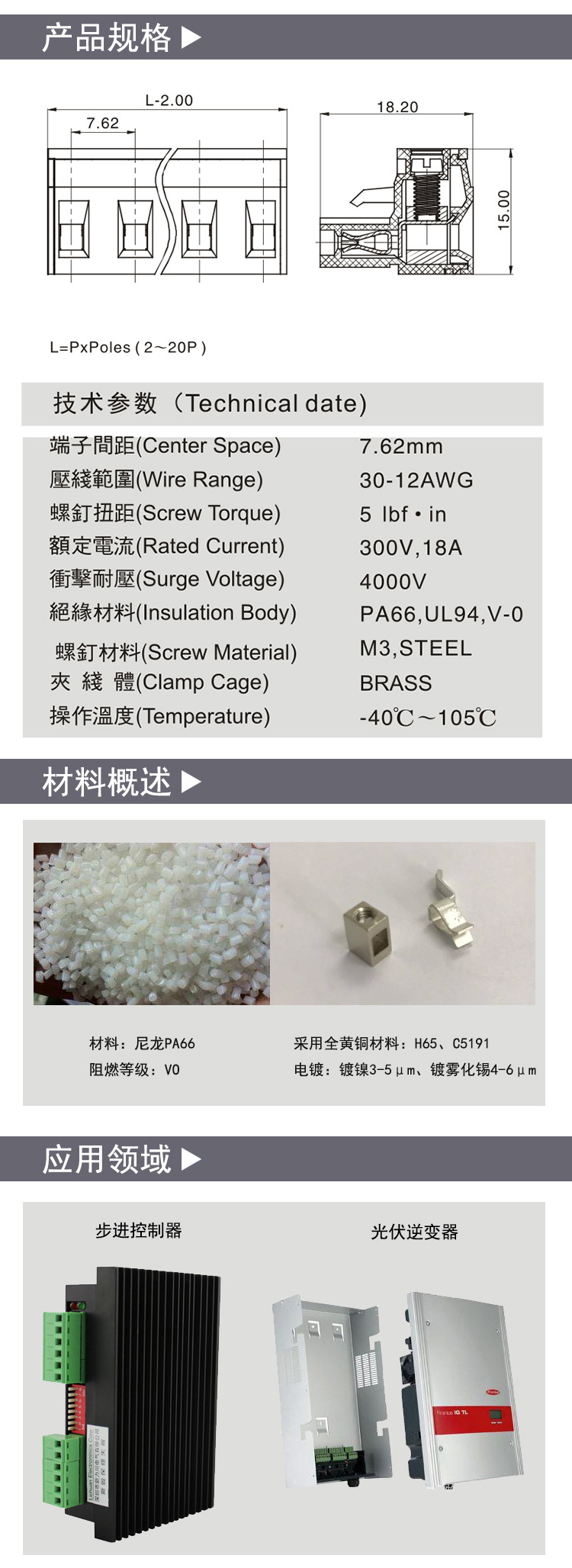 插拔式接线端子7.62间距180度直头 300V 15A 02P-24P