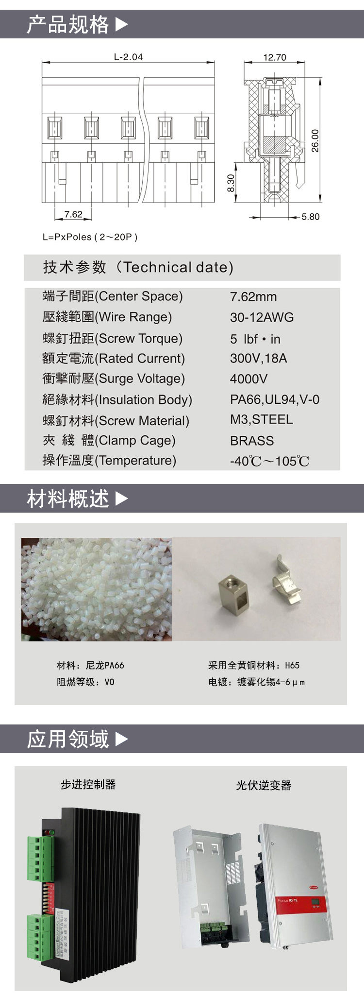 插拔式接线端子7.62间距180度直头 300V 15A 02P-24P