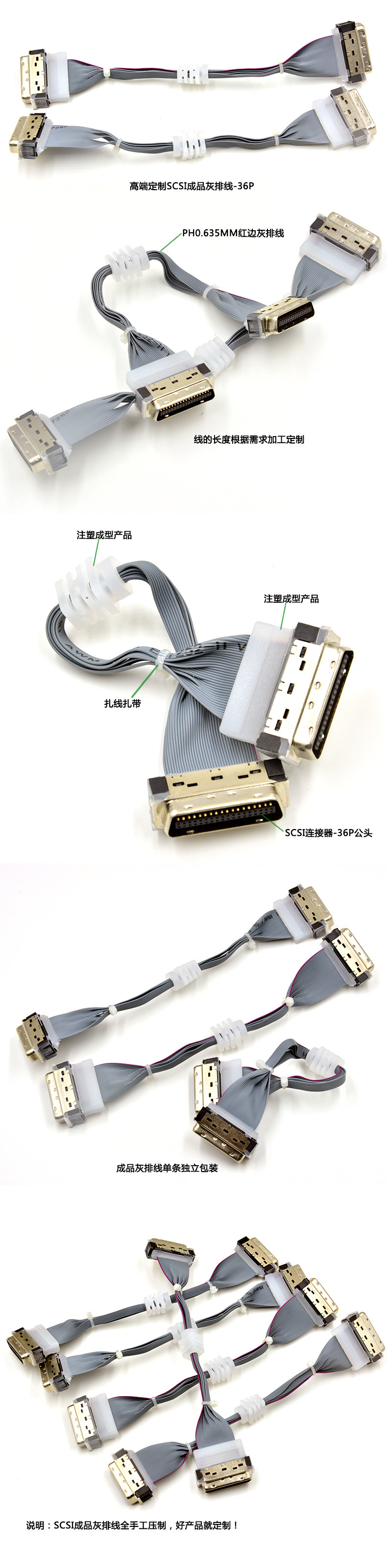 产品名称:SCSI成品灰排线-36P 灰排线间距:0.635MM (另有1.0MM 1.27MM 2.0MM 2.54MM) 灰排线规格:30AWG (另有32AWG28AWG 26AWG 24AWG) 铜线结构材质:先镀后绞 (先绞后镀铜包钢 铝镁丝 7股--12股