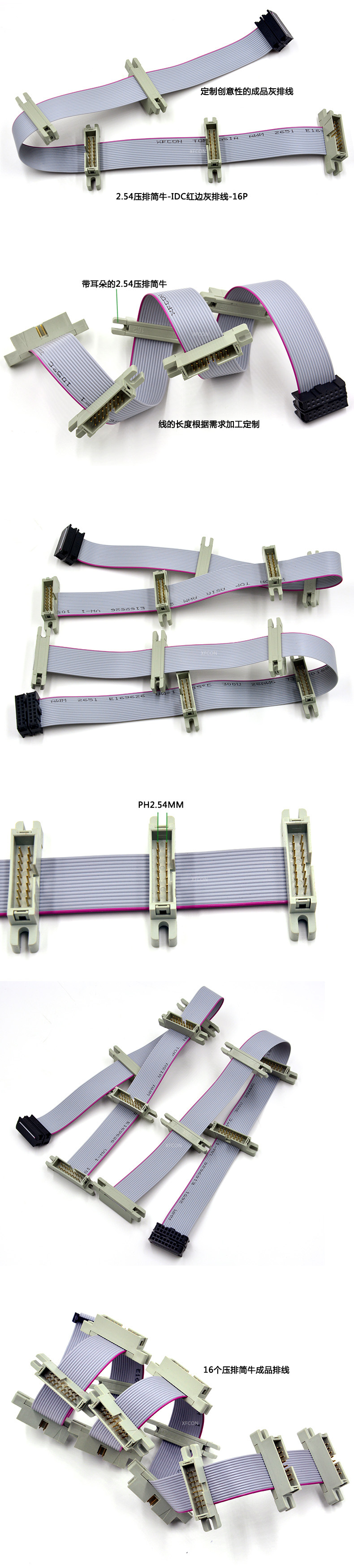 产品构成:2.54带耳朵简牛-16P、2.54IDC-16P连接器两件式、UL2651 28AWG红边灰排线-16P