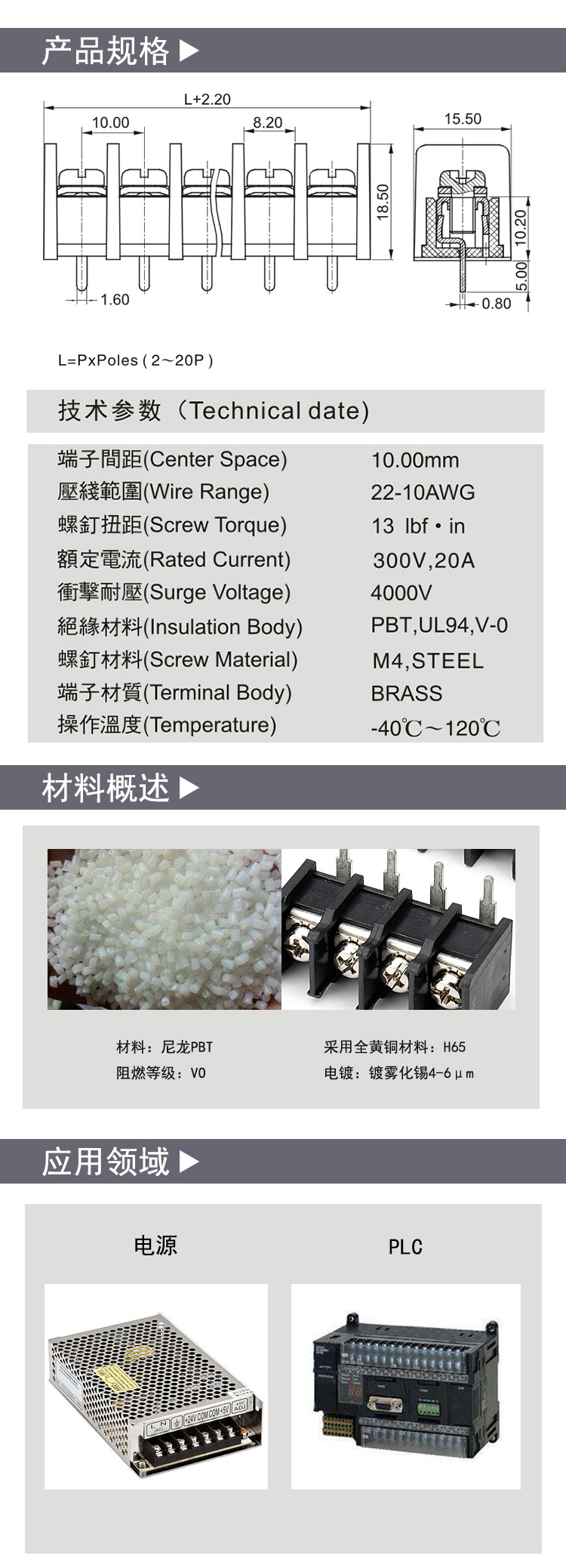 栅栏式PCB接线端子焊脚10.0间距;技术参数