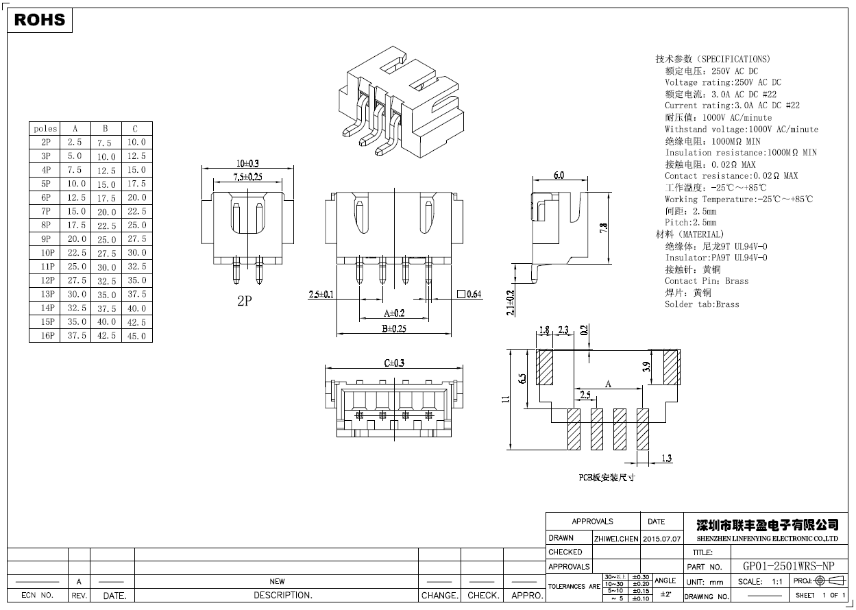 额定电流: 3A, AC/DC 额定电压: 250V, AC/DC 使用温度范围: -25℃-+85℃ 接触电阻: 10M max 绝缘电阻 : 1000M min 耐压 : 1000V AC/minute 产品应用: 应用于各类室内外LED智能照明灯条、TV背光模块LED灯条、