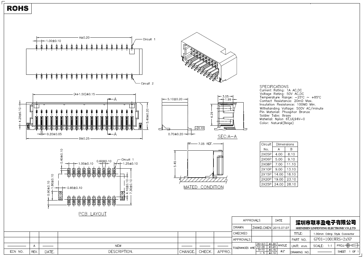 产品简介品名:线对板连接器规格:卧式/SMT90°间距:1.00mmPIN数:10-50PIN