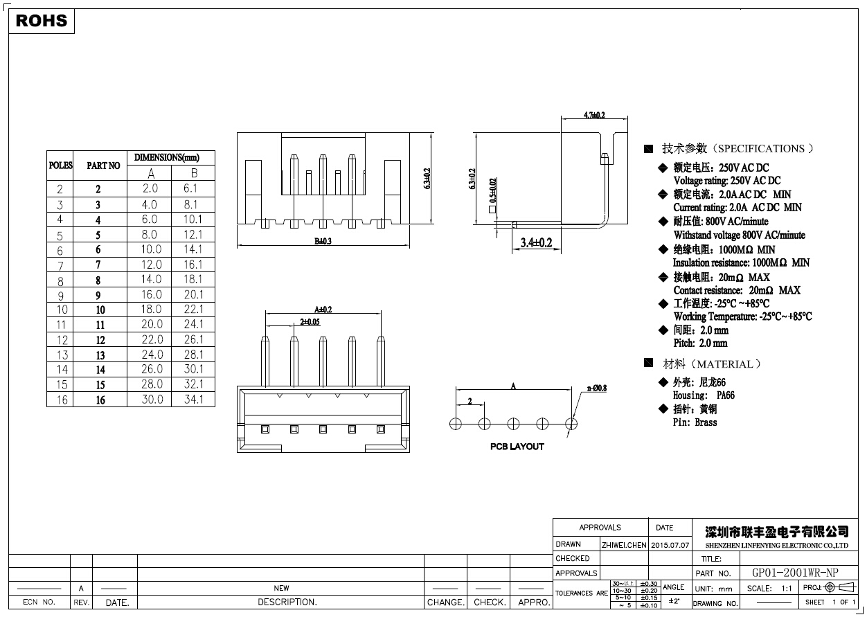 产品简介品名:线对板连接器规格:卧式/插件90°间距:2.00mmPIN数:2-18PIN