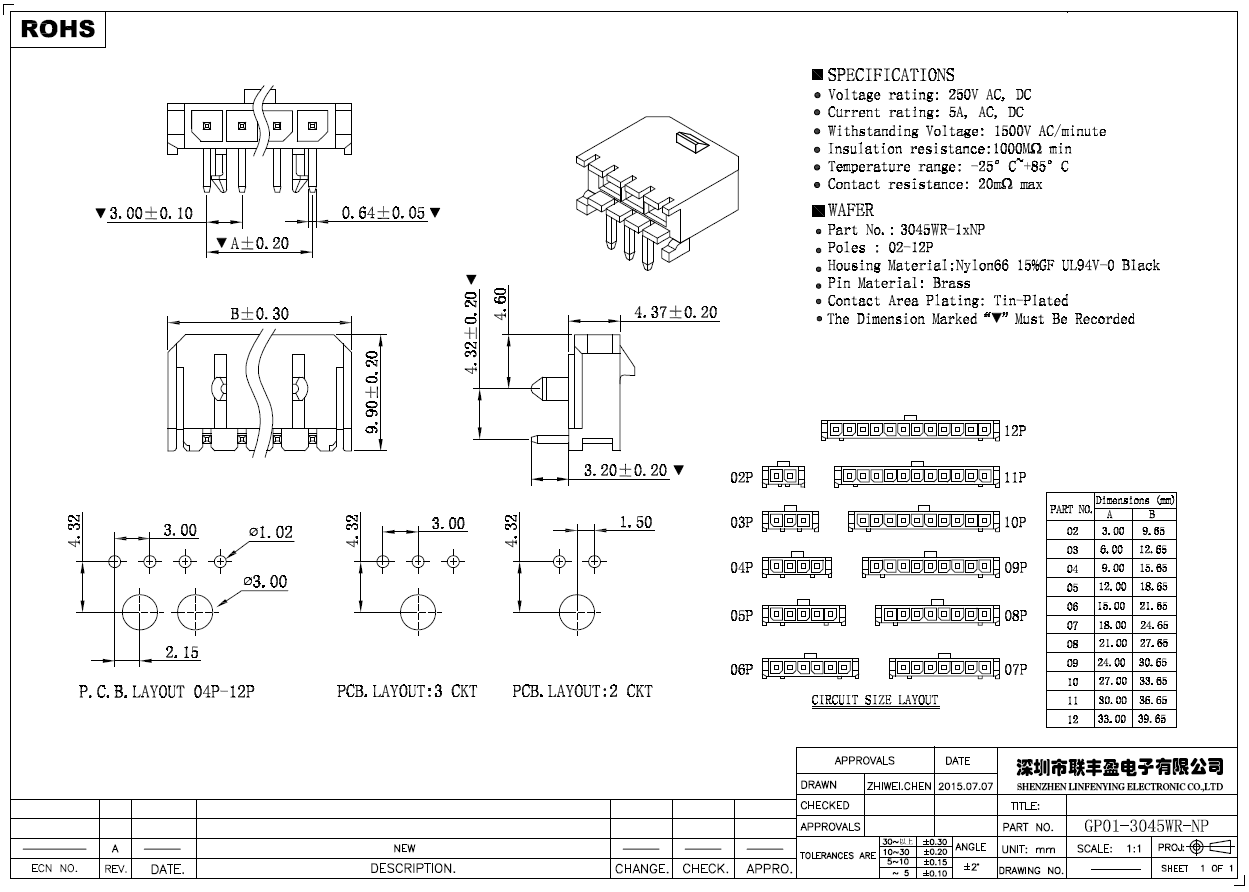 产品简介品名:线对板连接器规格:卧式/插件90°间距:3.00mmPIN数:2-12PIN