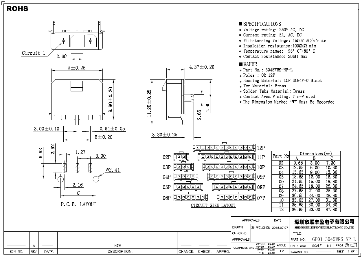 产品简介品名:线对板连接器规格:卧式/SMT90°间距:3.00mmPIN数:2-12PIN