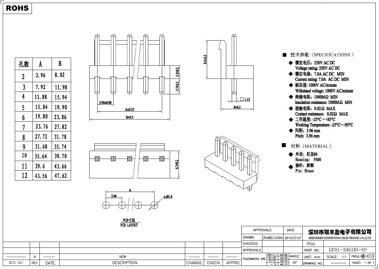 产品简介品名:线对板连接器规格:直式/插件180°间距:3.96mmPIN数:2-15PIN