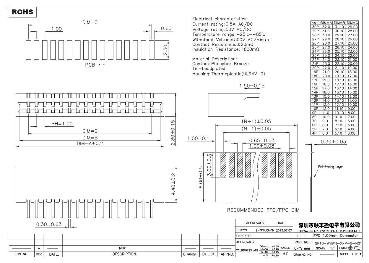 产品简介品名:FPC连接器规格:卧式贴片/90°间距:1.0mmPIN数:4P-30P高度:2.8mm