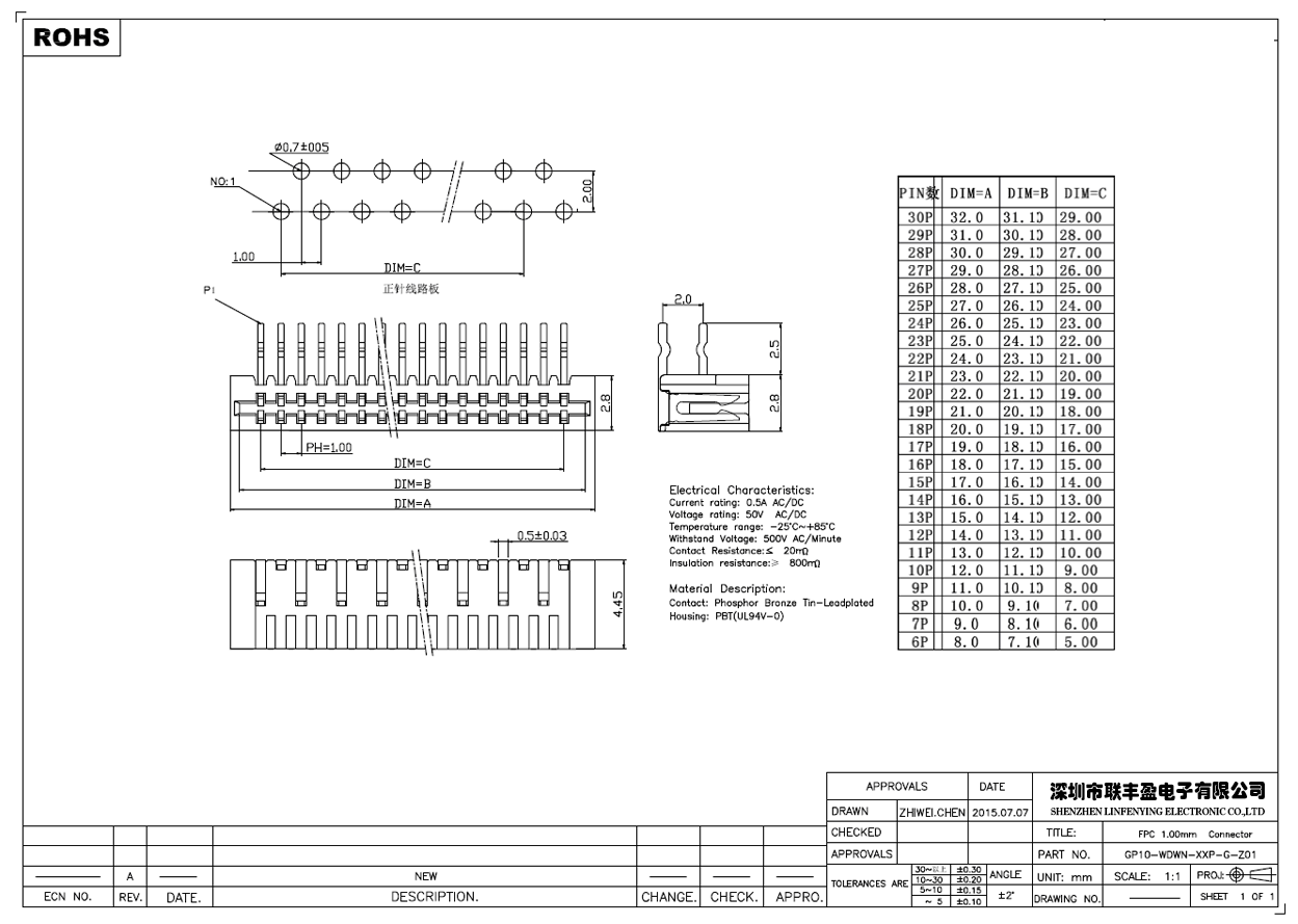 产品简介品名:FPC连接器规格:卧式直插/90°间距:1.0mm/正向PIN数:6P-30P高度:2.80mm