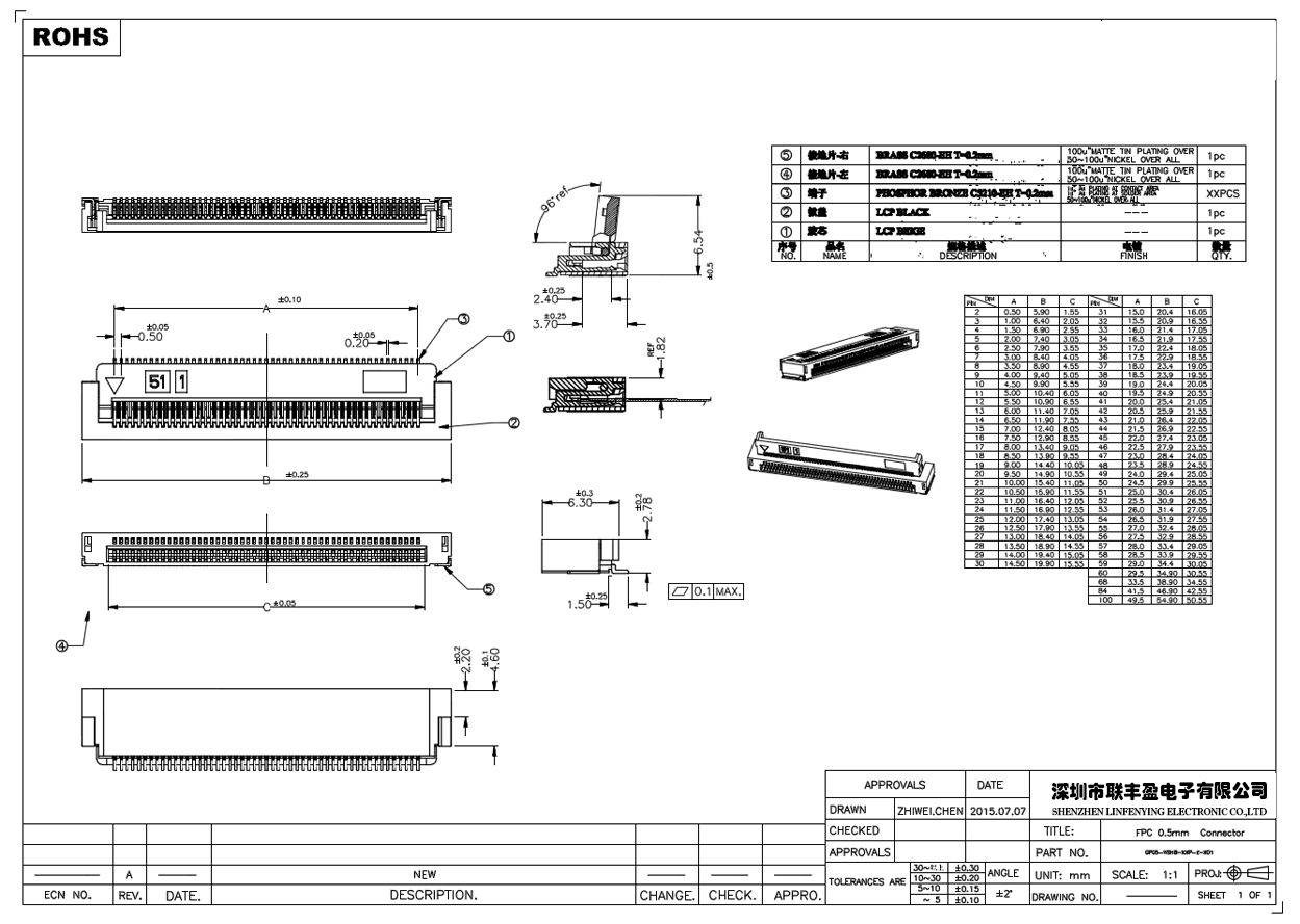 产品简介品名:FPC连接器规格:卧式贴片/90°间距:0.5mm/后翻盖PIN数:4P-40P高度:2.80mm