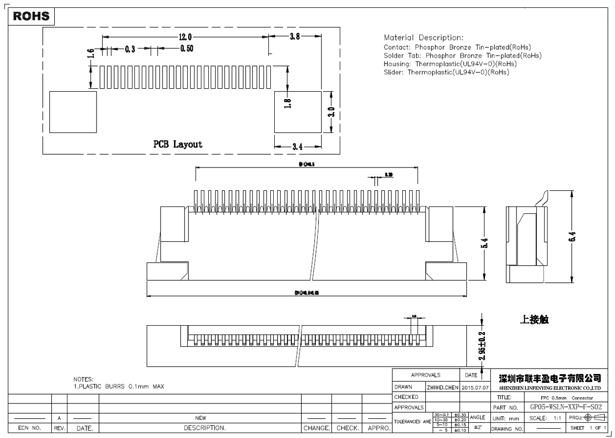 产品简介品名:FPC连接器规格:卧式贴片/90°间距:0.5mm/拉拔上接触PIN数:4P-60P高度:2.95mm