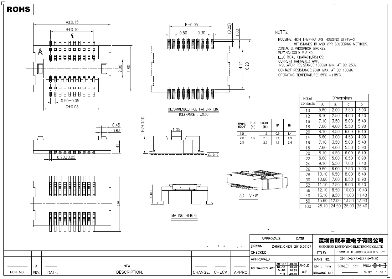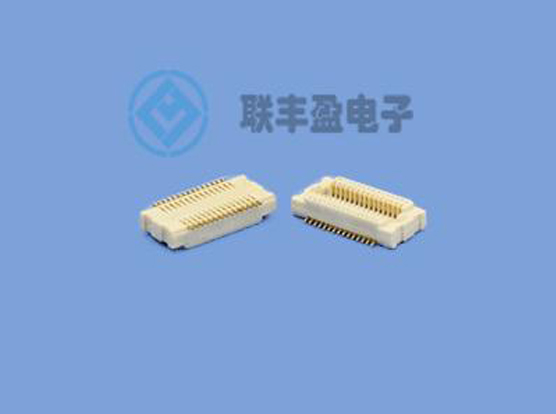 产品简介品名:0.5mm单槽板对板连接器母座型号:LFY02-5xx-GxxS-WOR规格:0.5mm间距/立式180°PIN数:10-100PIN塑胶颜色:米黄色