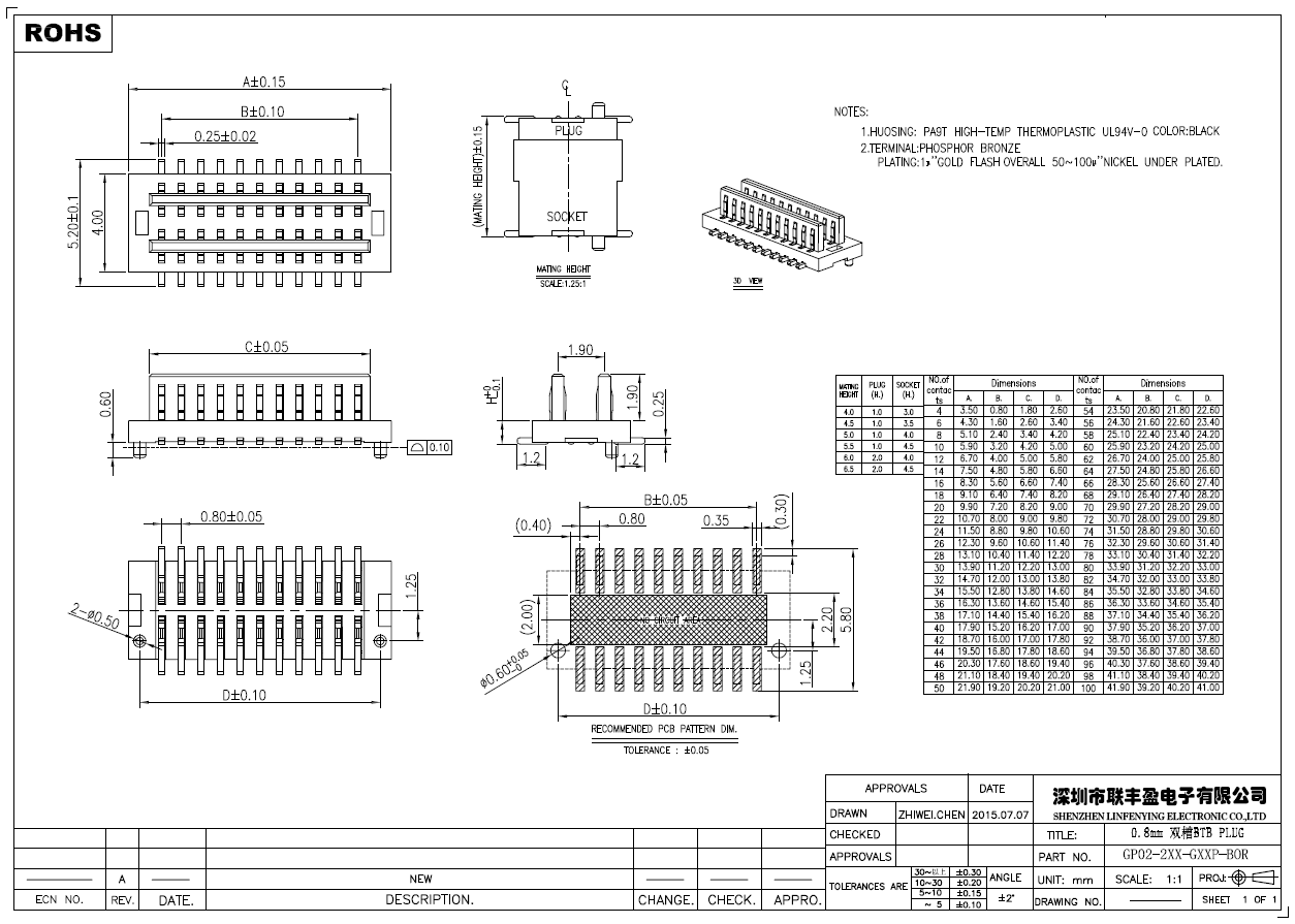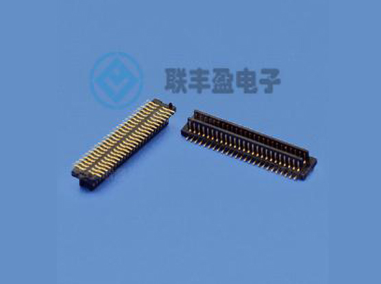 产品简介品名:0.8mm双槽板对板连接器公座型号:LFY02-2XX-GxxP-BOR规格:0.8mm间距/立式180°PIN数:4-100PIN塑胶颜色:黑色