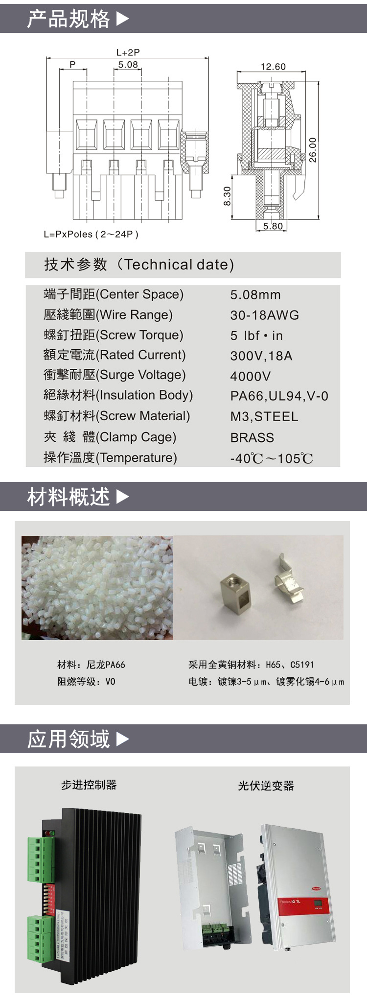 插拔式接线端子5.08间距180度直头法兰 300V 15A 02P-24P