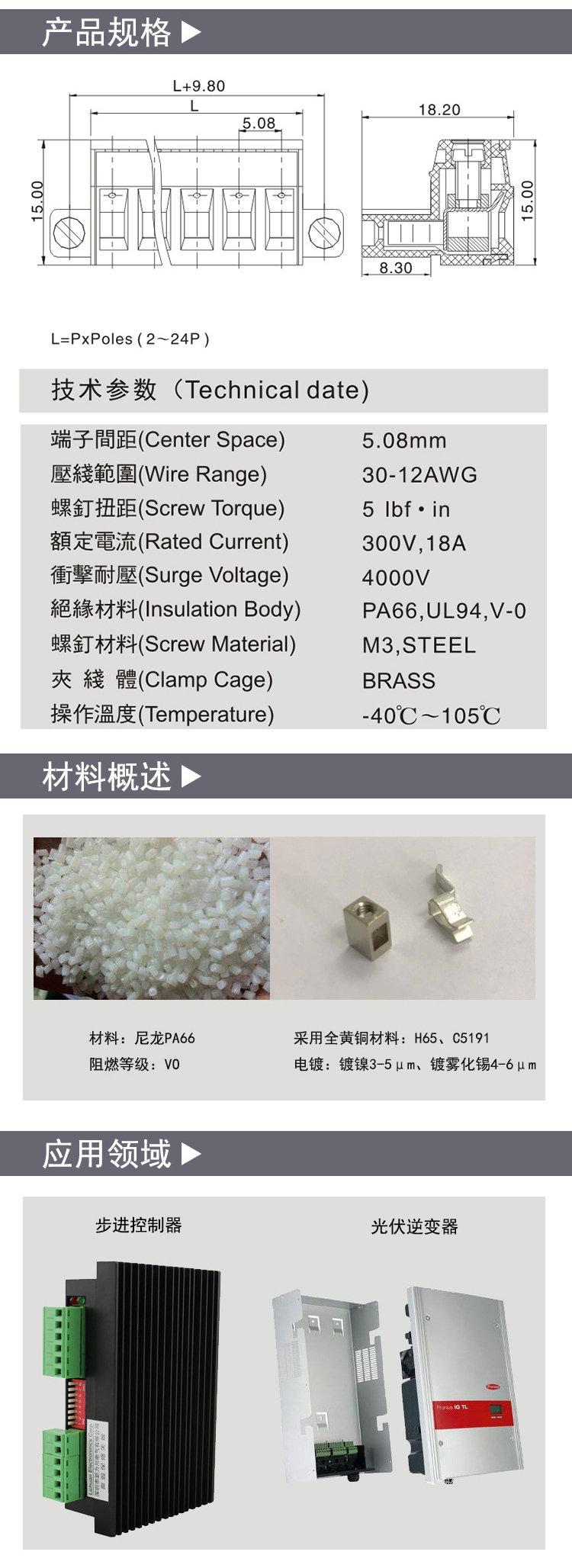 插拔式接线端子5.08间距90度弯头法兰 300V 15A 02P-24P