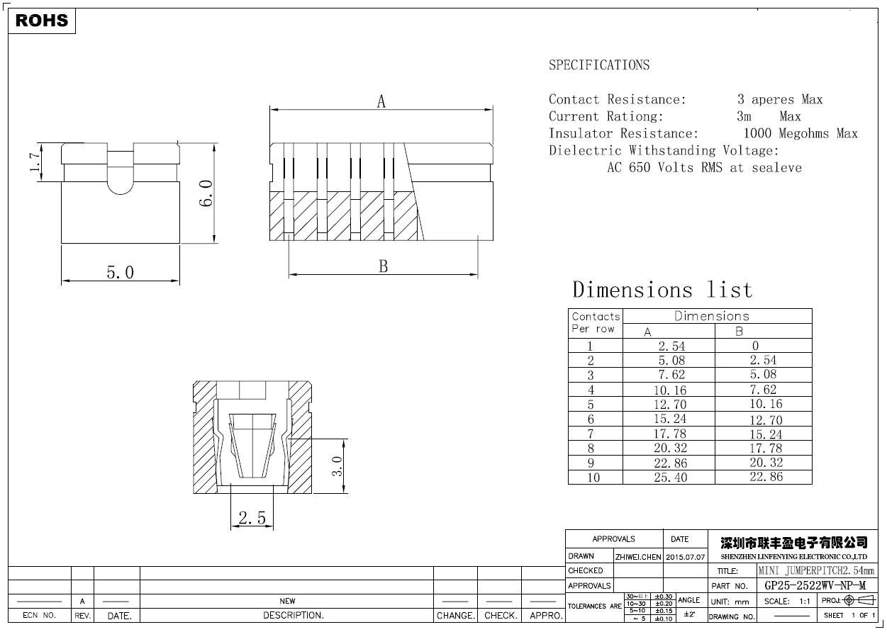 产品简介 品名:短路帽 规格:插件/直式180° 间距:2.54mm PIN数:2PIN 备注:排母系列