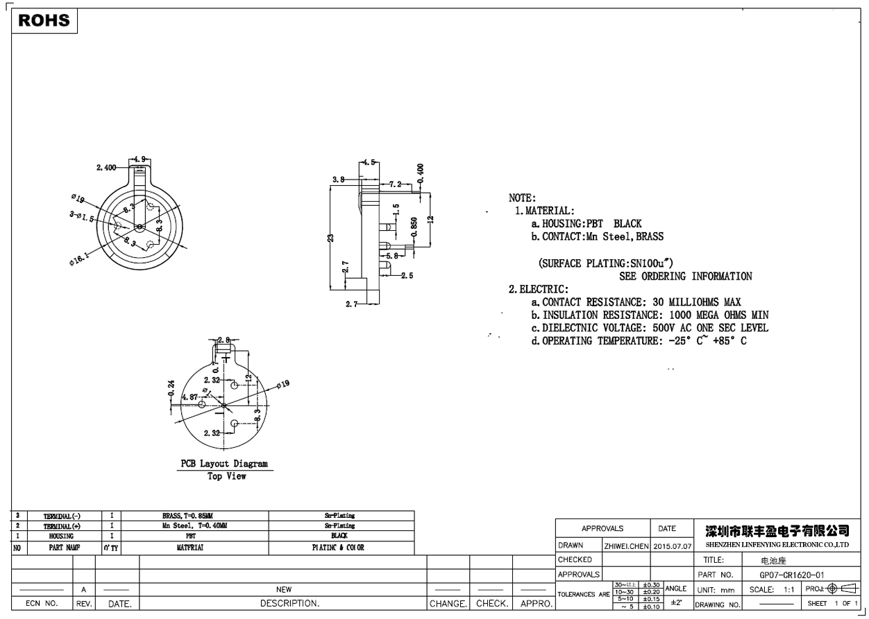 产品简介品名:电池座产品型号:LFY07-CR1620-01电池型号:CR1620产品规格:DIP/插件式备注:黑色