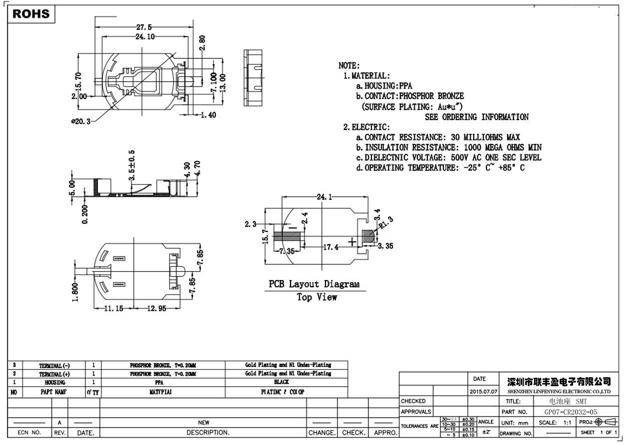 产品简介品名:电池座产品型号:LFY07-CR2032-05电池型号:CR2032产品规格:SMT/贴片式备注:黑色