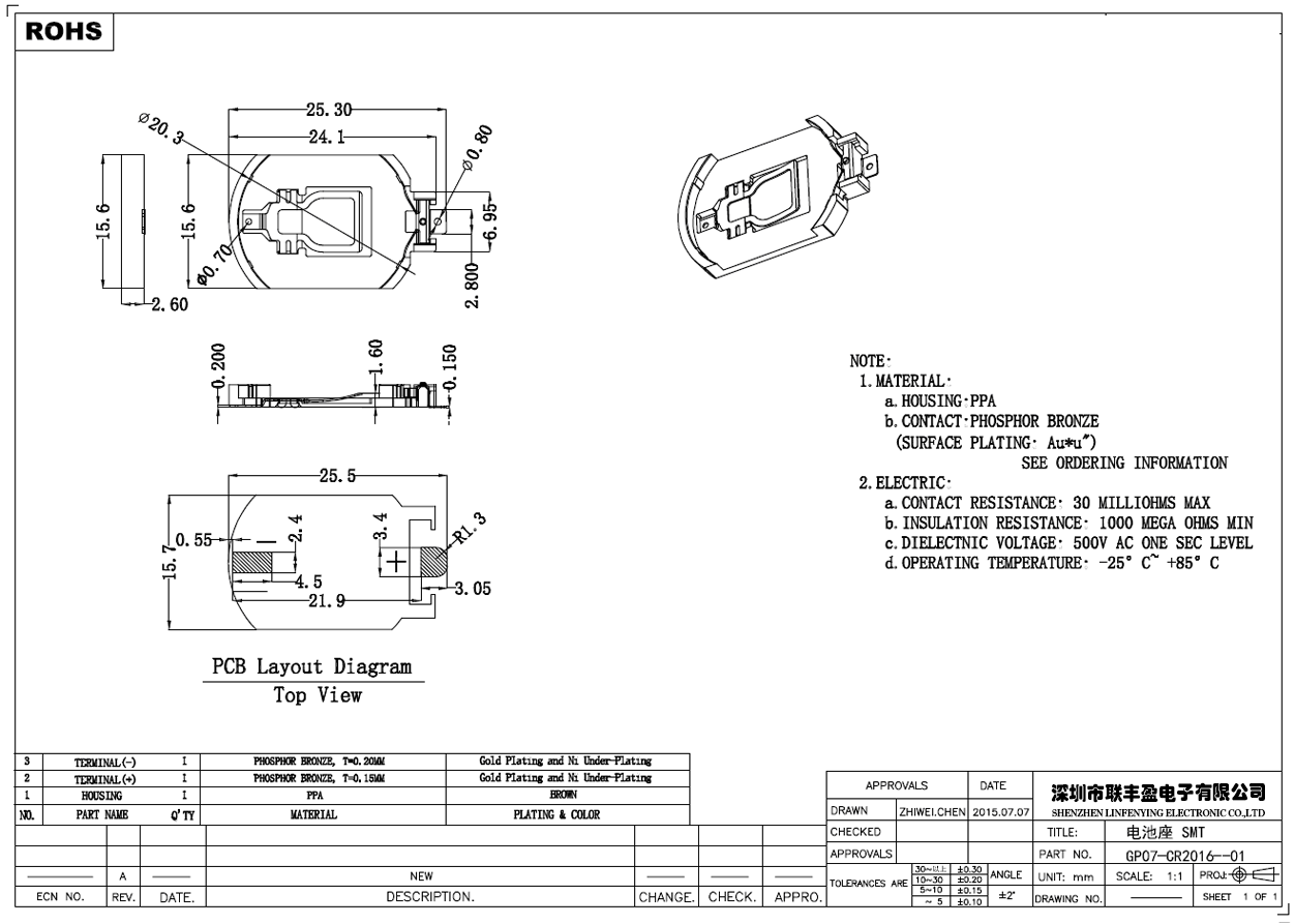 产品简介品名:电池座产品型号:LFY07-CR2016-01电池型号:CR2016产品规格:SMT/贴片式备注:棕色