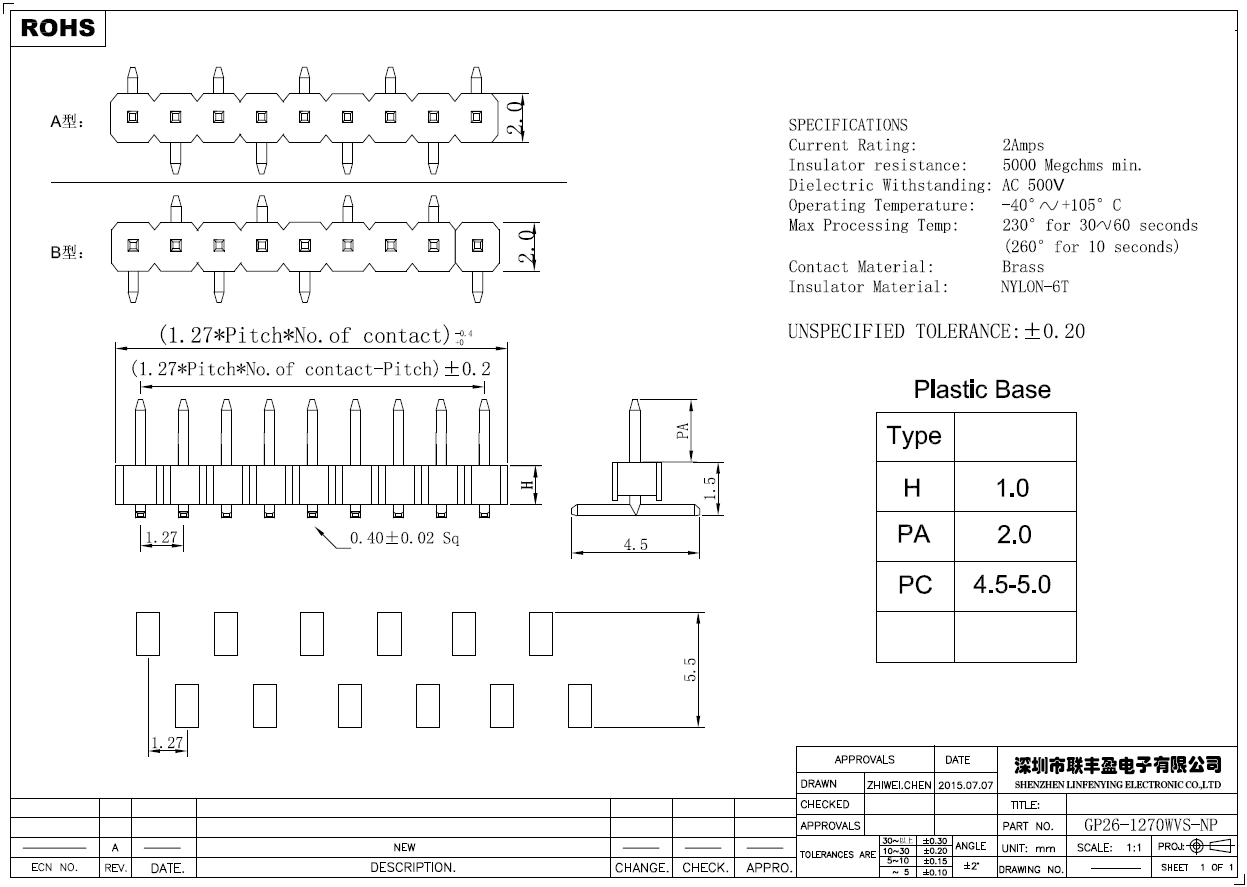 产品简介品名:排针规格:贴片/立式180°间距:1.27mmPIN数:2-40PIN备注:排针系列