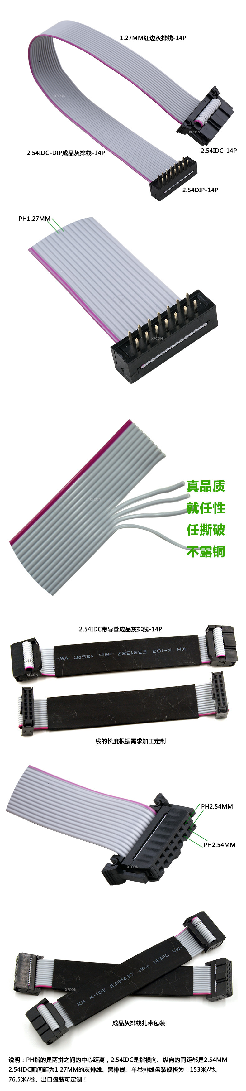 产品名称:2.54IDC-DIP成品灰排线-14P 灰排线间距:1.27MM 灰排线规格:265128AWG 铜线结构材质:先镀后绞 【另有:先绞后镀铜包钢 铝镁丝】 铜芯线导体:7/0.12MM (7为7股铜线) 外被颜色: