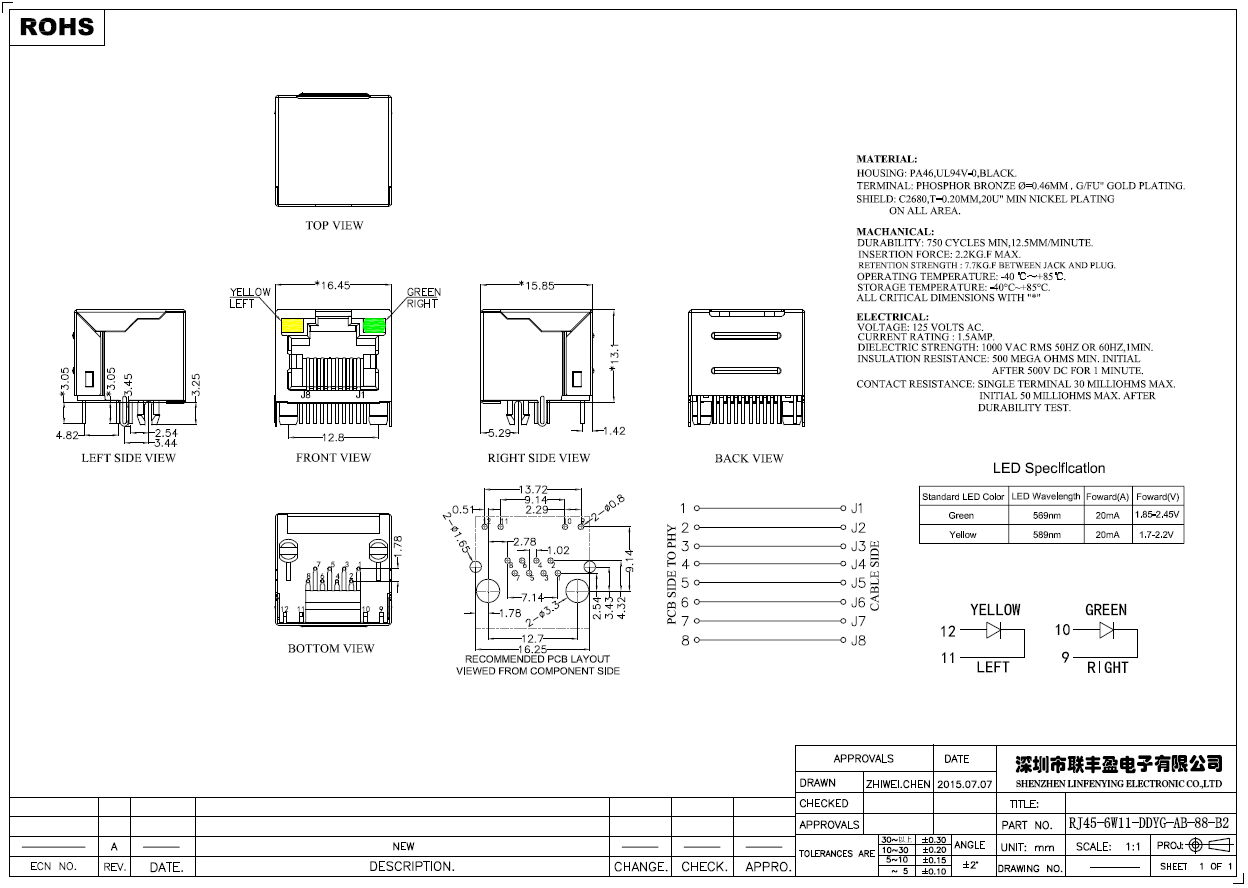 产品简介品名:RJ45网络连接器规格:卧式插件/90°外壳:带屏蔽LED灯:黄/绿-其它颜色可定制塑胶颜色:黑色/其它颜色可定制