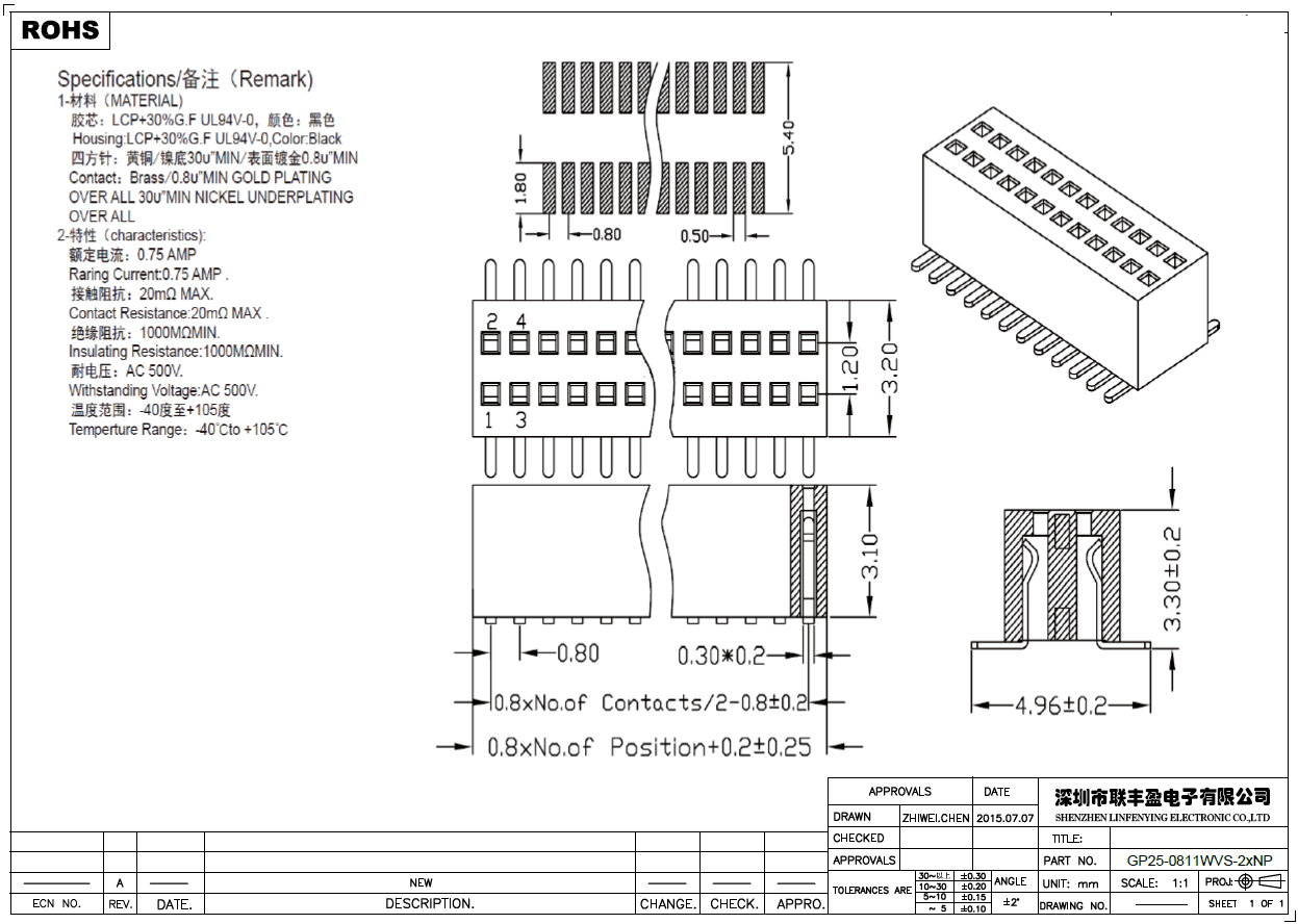 产品简介品名:排母规格:贴片/立式180°间距:0.8mmPIN数:2-50PIN备注:排母连接器系列