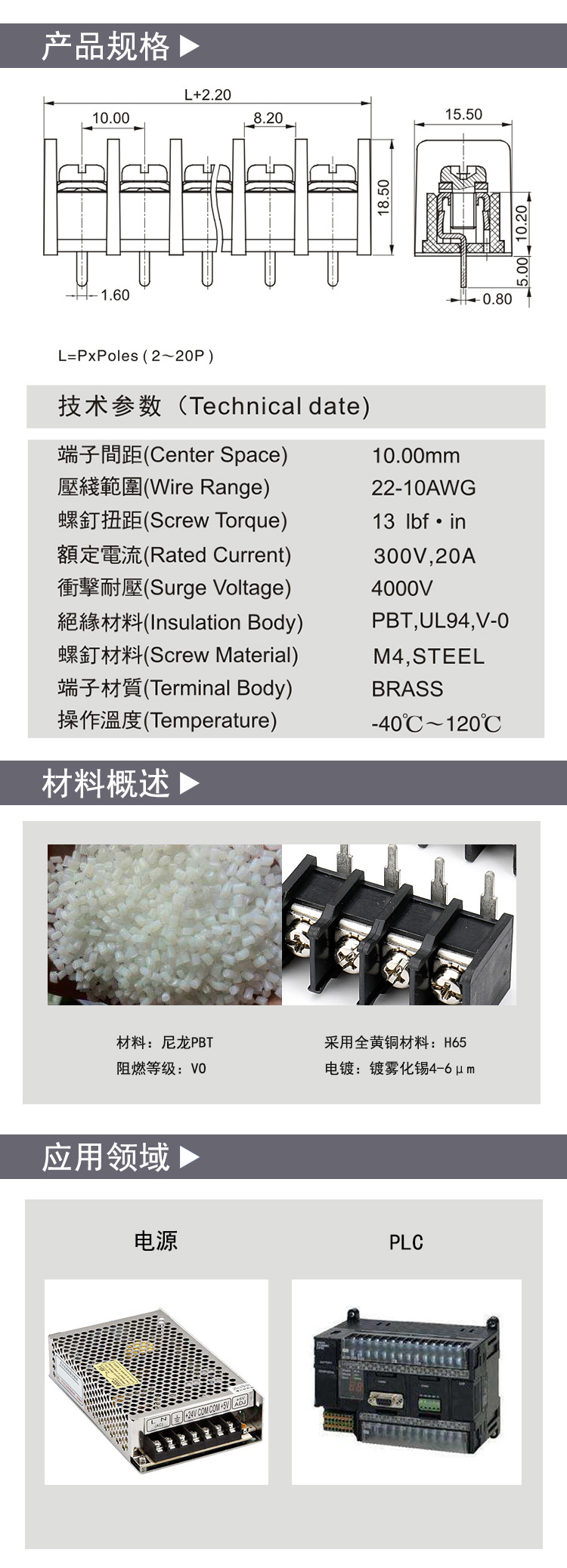 栅栏式PCB接线端子焊脚折弯10.0间距;技术参数