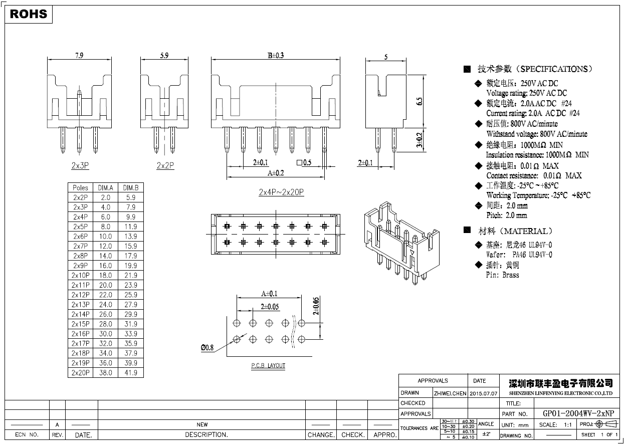 产品简介品名:线对板连接器规格:直式/插件180°间距:2.00mmPIN数:4-36PIN