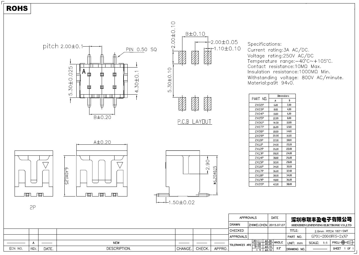 产品简介品名:线对板连接器规格:立式/SMT180°间距:2.00mmPIN数:4-40PIN