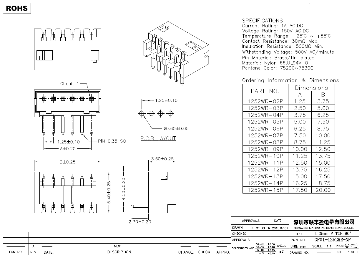 产品简介品名:线对板连接器规格:卧式/插件90°间距:1.25mmPIN数:2-15PIN