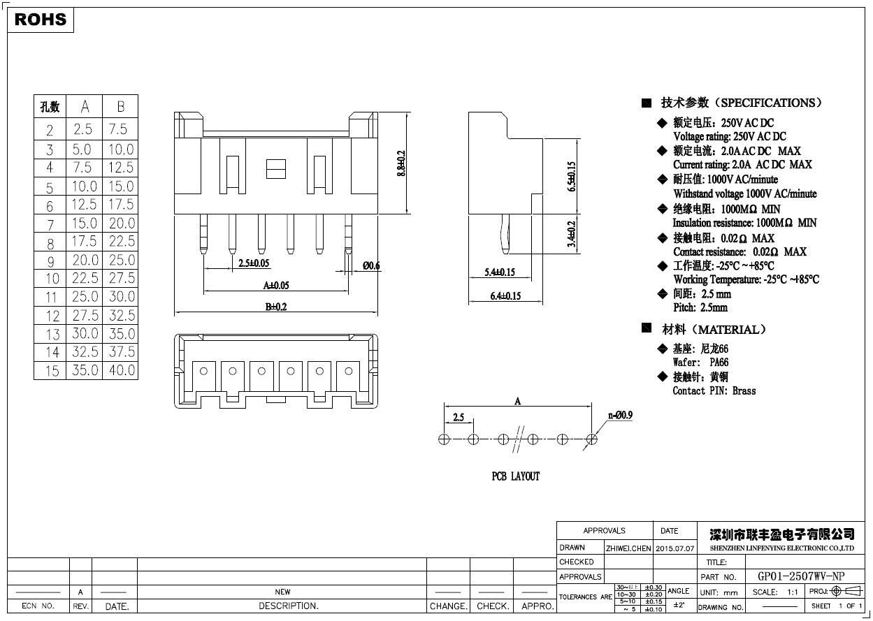 产品简介品名:线对板连接器规格:直式/插件180°间距:2.50mmPIN数:2-15PIN