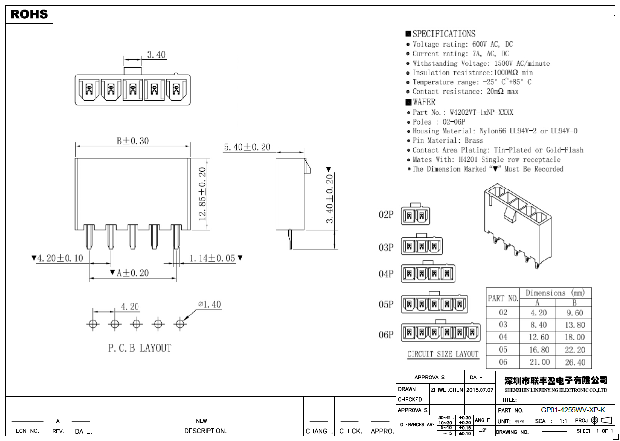 产品简介品名:线对板连接器规格:直式/插件180°间距:4.20mm/空心针PIN数:2-6PIN
