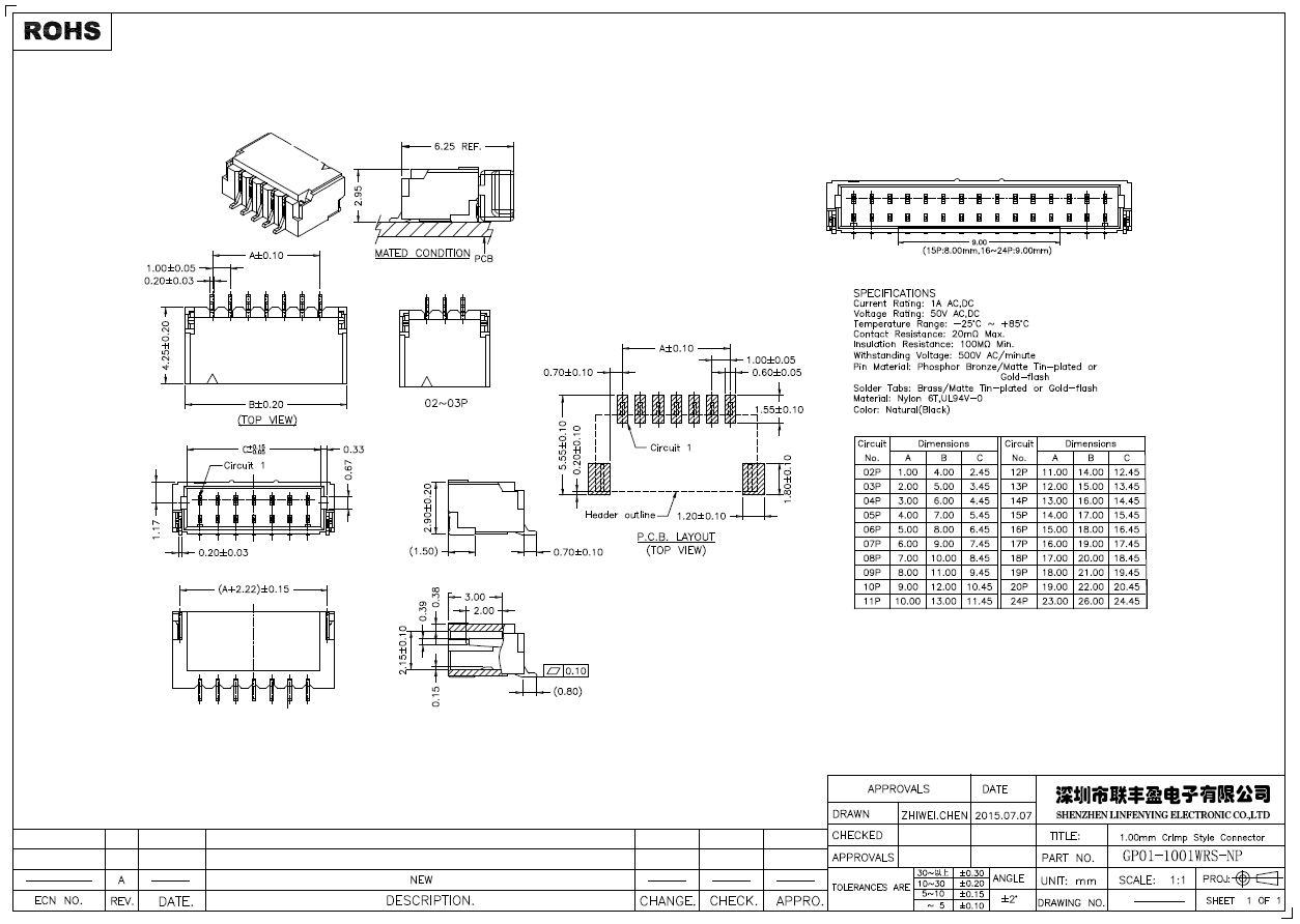 LFY01-1001WRS-NP产品简介品名:线对板连接器规格:卧式/SMT90°间距:1.00mmPIN数:2-24PIN