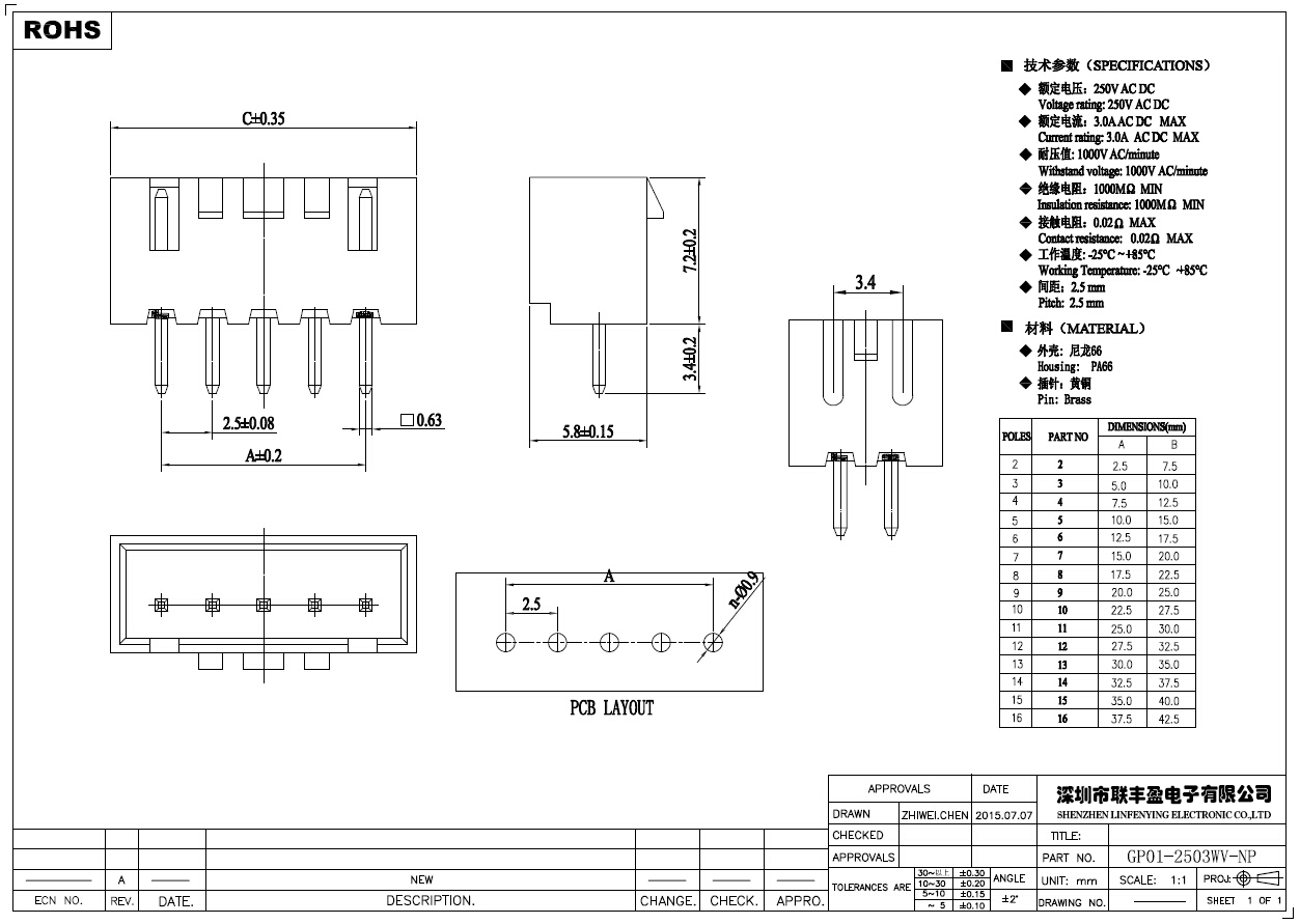 产品简介品名:线对板连接器规格:直式/插件180°间距:2.50mmPIN数:2-15PIN